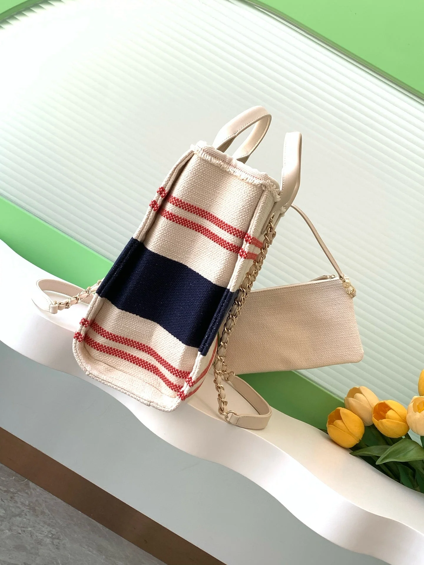 CHANEL SHOPPING BAG 34 IN WHITE RED AND NAVY BLUE CANVAS quantity
